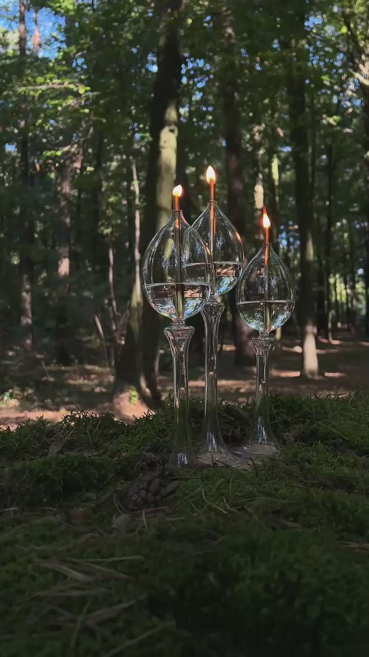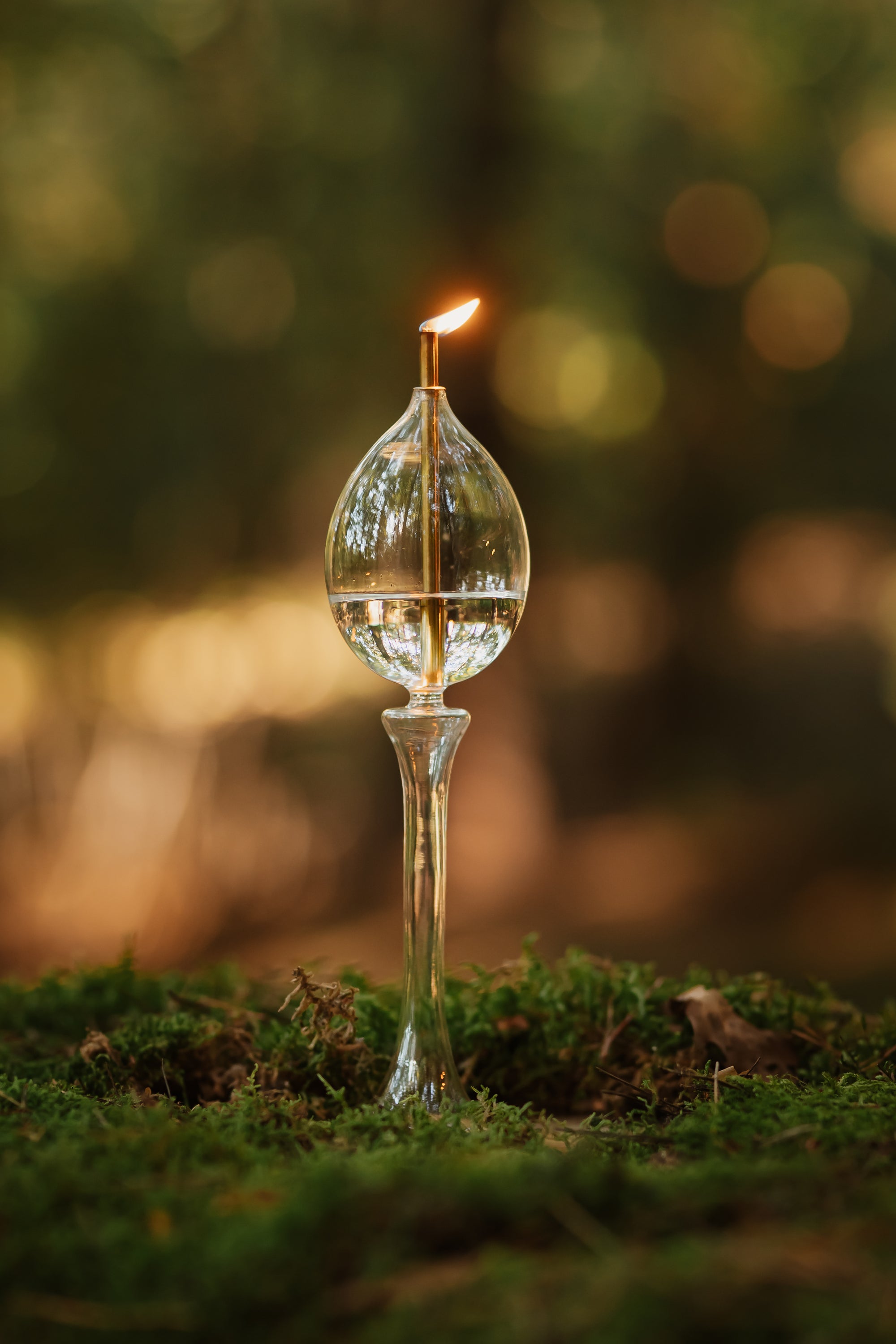 One steel wick in a noble gold hue, held within a slender glass pedestal.